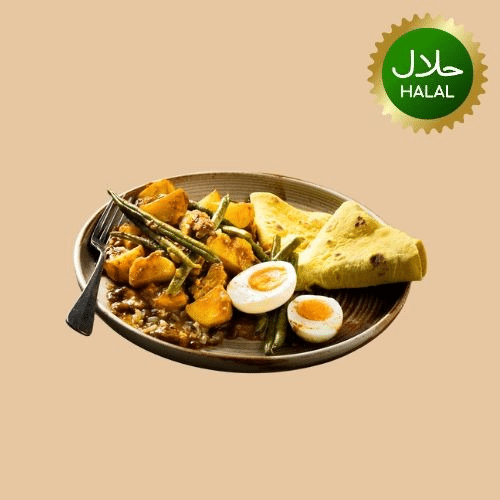 Roti met kip, kousenband, Kerrie ei, aardappel. Halal